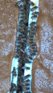 We fed the girls Sunday night – first time in two weeks. They had totally demolished the last patties, other than a speck of paper still inside he hive from the last meal. They tore into the new patties within seconds. Watching them belly up to the edges of the protein/carbohydrate patties like cattle at a trough was fascinating. Since rain in a constant in the forecast for a while, we’re not sure when we’ll get back as we need dry weather to get through the field to the site.