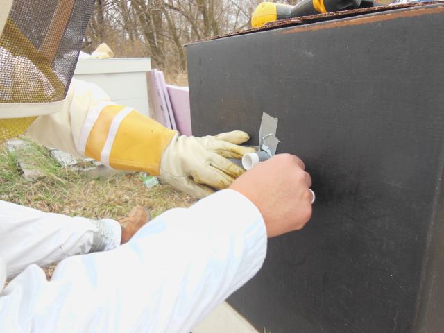 It’s also common practice to drill a hole in the face of the top hive body, so that if snow covers the normal entrance at the bottom of the hive, the bees can still get in a out via the upper hole. “Huh?” you say, “Why would bees want to leave the colony during the winter?” If it gets above 50 degrees the girls are going to fly. Honeybees are fastidious – – when it gets warm enough in the winter they go on ‘poop runs’ to clear out what has piled up on those cold days.  Because we have multiple layers thus winter (cardboard + insulation) Mark was concerned that shifting could occur, resulting in a blocked entry. So! After drilling the hole we installed a little piece of PVC and taped it in place to keep it from moving.