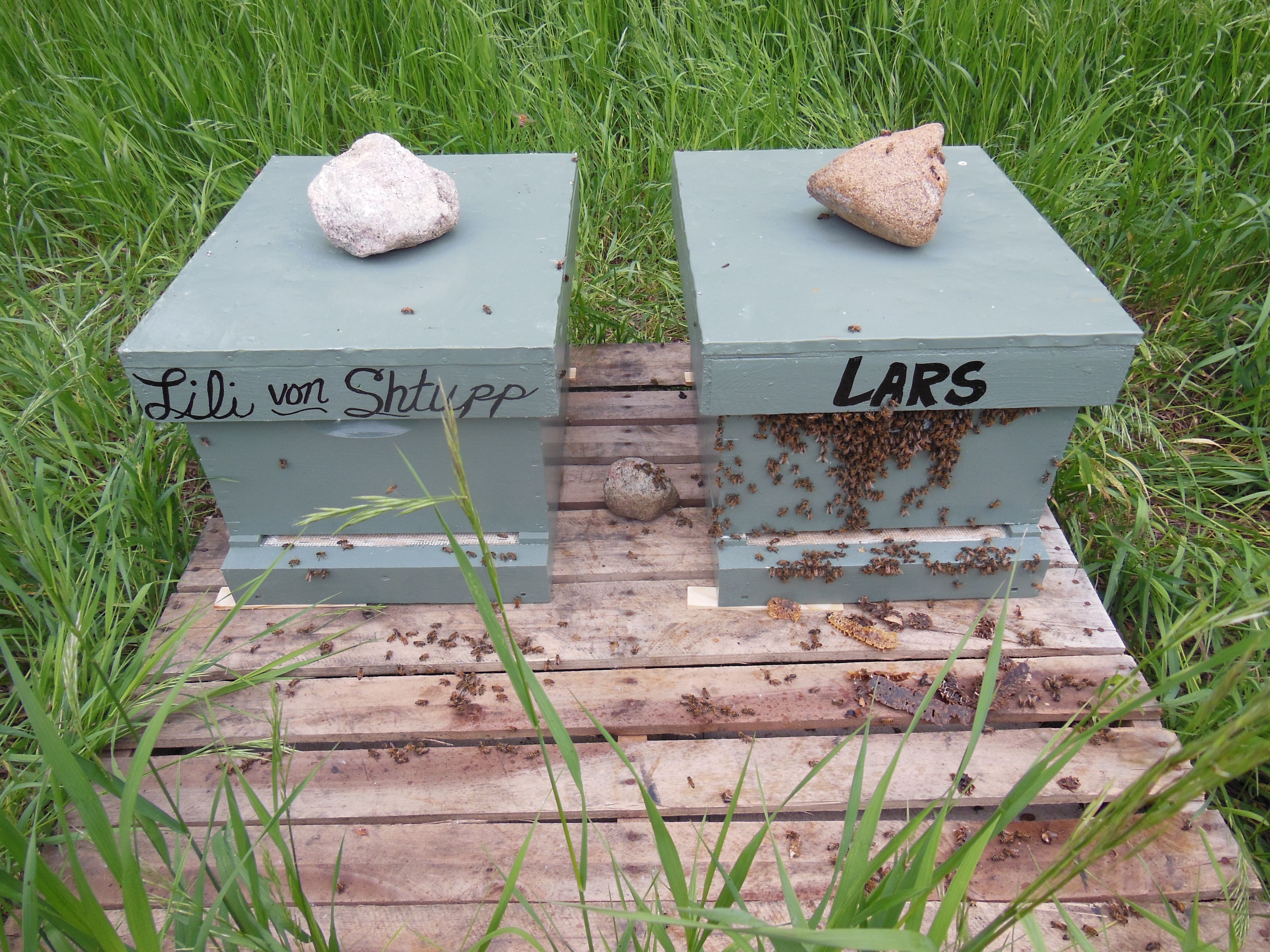 And finally, we also started our own nuc form Lena. In early June we found queen cells in Lena – that is a bad sign in the spring. Lena was so crowded she was preparing to swarm, meaning a new queen would emerge and take half the bees and leave. Homo sapiens call ‘divorce’. = Half your sh*t disappears. To stop the ‘bee divorce’ we put the frames with queen cells in a small box, a nuc, where we’re letting queen-making-magic happen. Once a queen is situatied and laying eggs, we’ll move that burgeoning colony back into Ole and viola (!) we’ll be five full colonies. If our nuc-making goes well, that means we saved $130 by not having to buy one. 😮