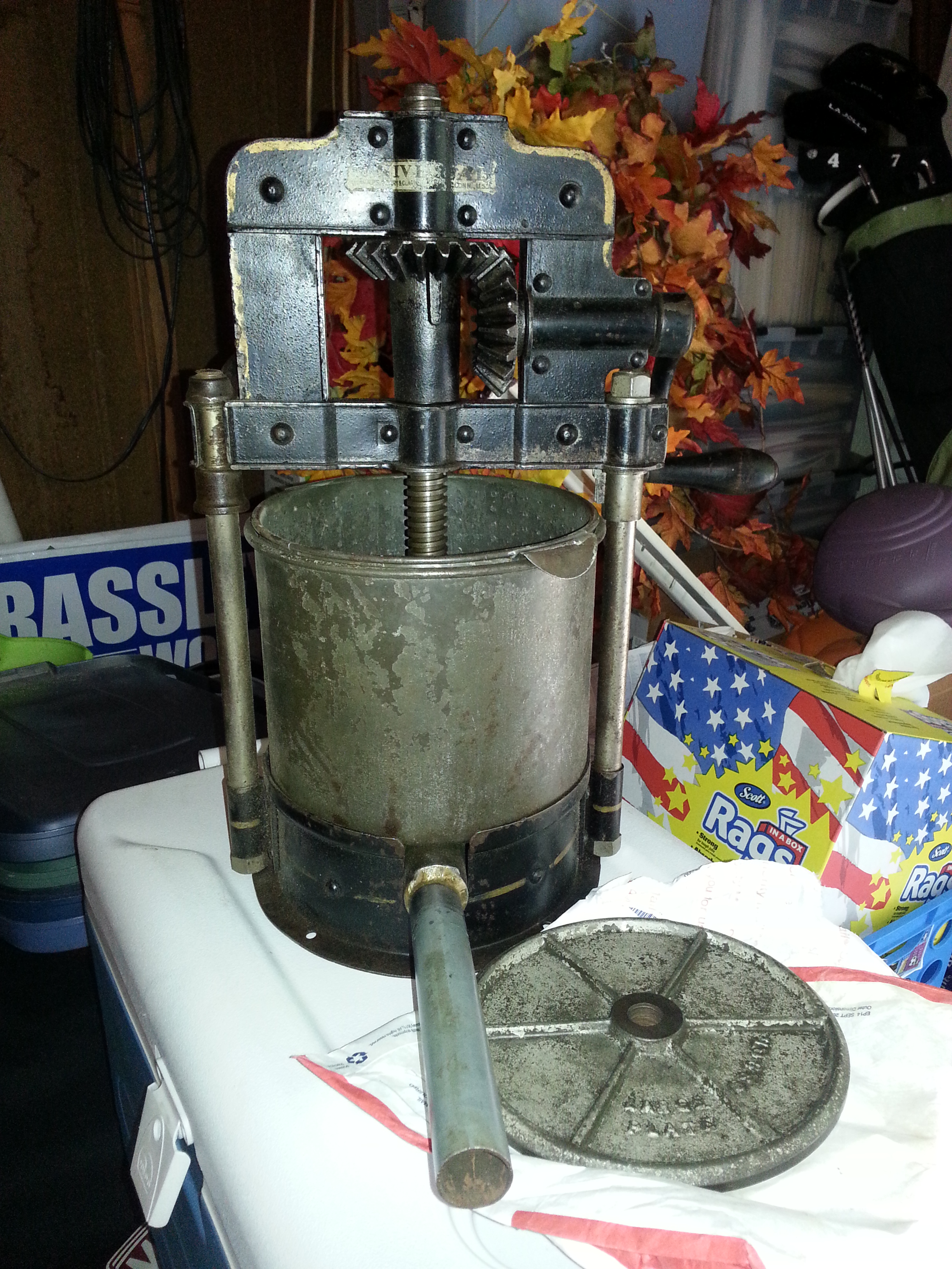 Fast forward through the summer of 2013, with our fingers crossed that the bees would be able to yield well even though we had a spring flood … and then another summer drought. The girls came through and we harvested enough honey to begin to dabble in brewing mead. We gathered supplies like bottles, brushes, sanitizing supplies, thermometer, hydrometer, siphon, wine thief, different yeasts, spices, sugars, etc., and cider. In fact, we walked right off the plank of insanity and bought a 100-yr old cider press off of eBay and found plans on the Internet on how to modify a garbage disposal into an apple crusher. Through the amazing generosity of friends in the ‘Burg, a stunning amount of apples appeared on our front porch. Two full days of manual labor later, we had 8.5 gallons of apple cider to begin the project. We also bought a gallon of apple cider, for a brewing comparison. On October 20 we christened the start of 4 gallons of cyser and 5 gallons of hard cider.