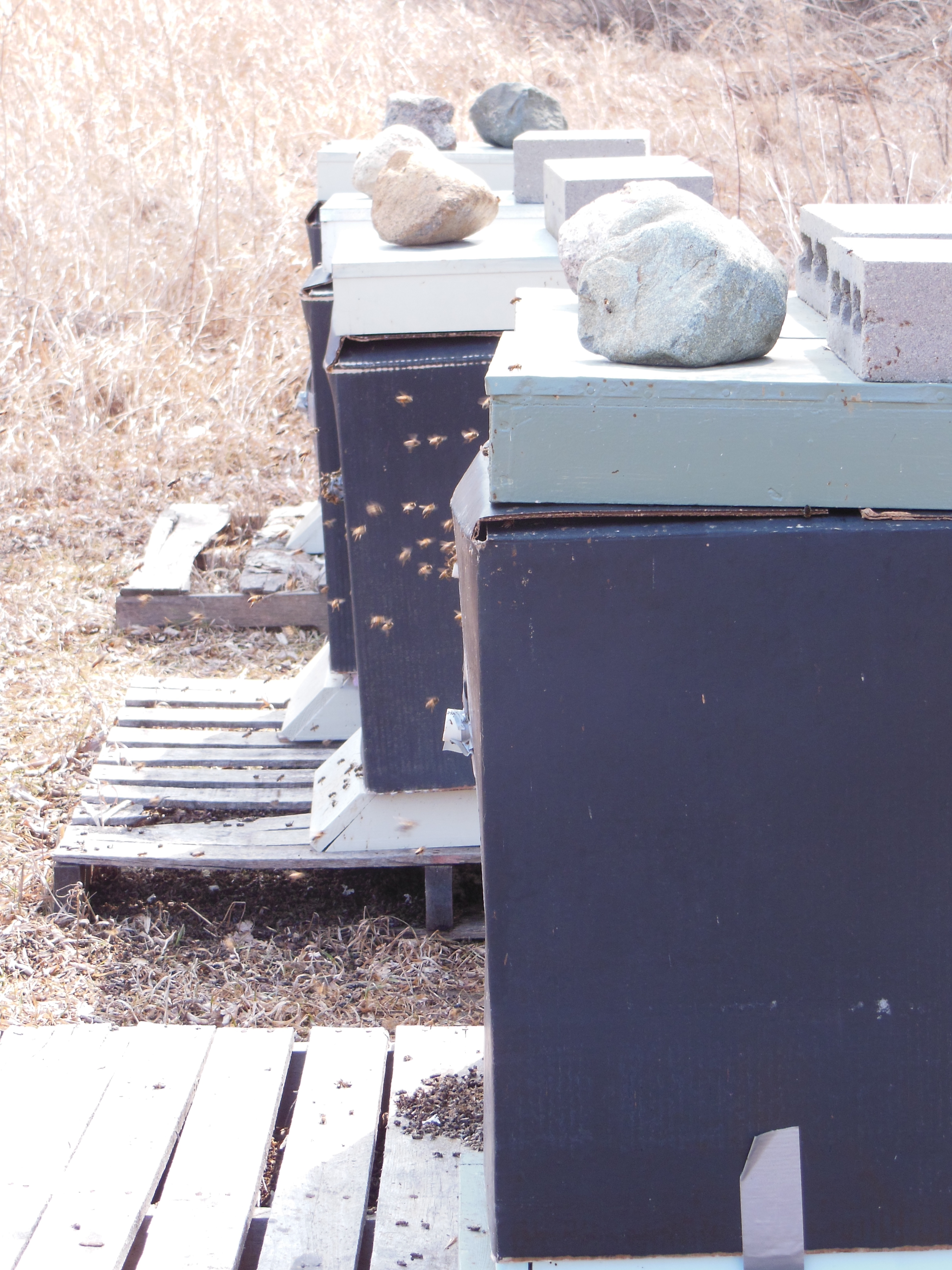 It was a beautiful sight, seeing so many bees in the air when we arrived. We fed more patties, as four of the five hives had mowed the last batch down. And, we flipped the hive bodies around, moving top to bottom, and did some general spring cleaning of the bottom boards. We saw lots of eggs and larvae, so that means they’re ramping up their numbers for the growing season. We didn’t take many pictures because once the hives were opened up there were thousands of bees in the air and Robin didn’t think running around with her glove off was in her best interest.