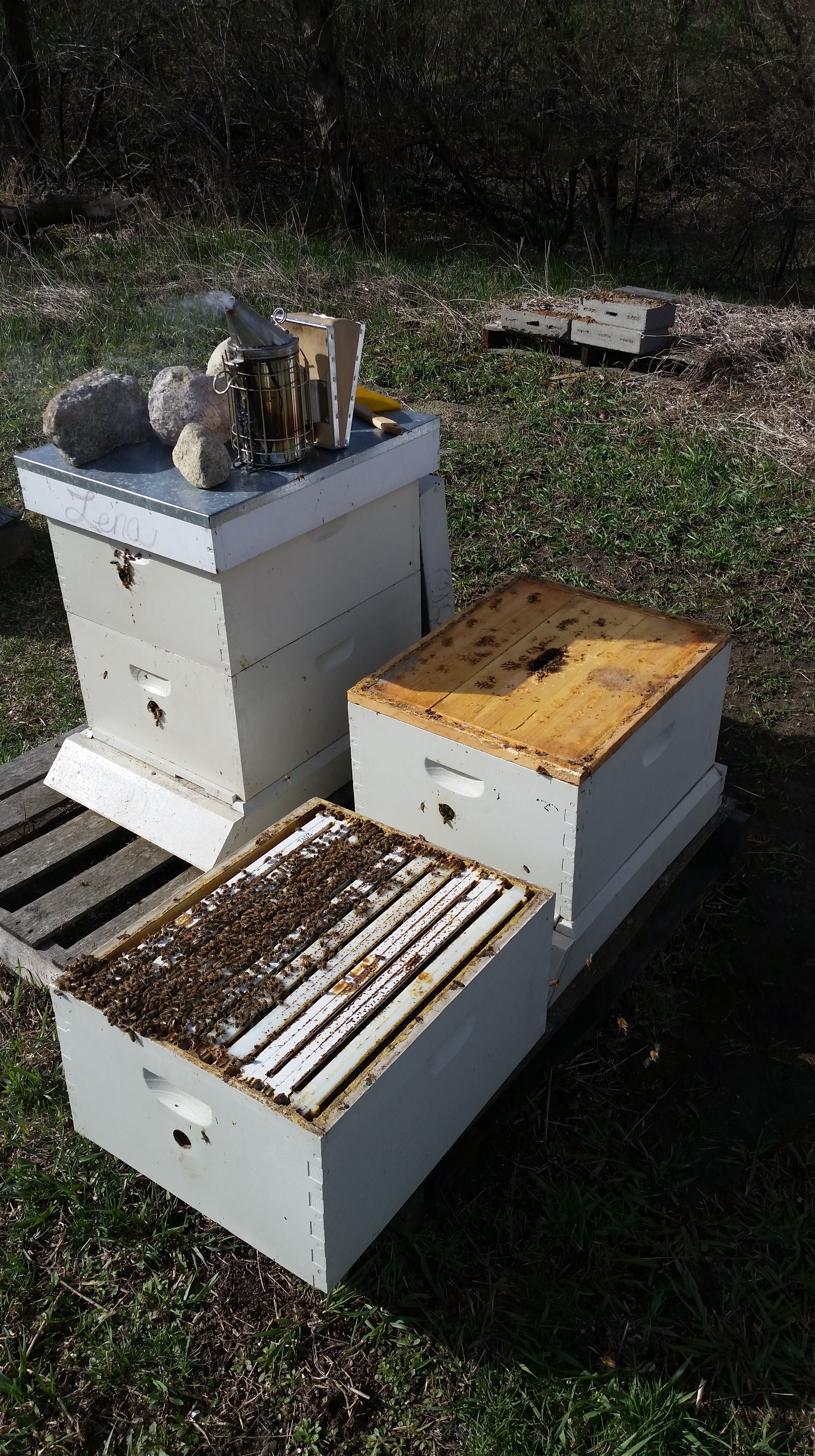 It was supposed to rain later in the day on Sunday. So, early in the day we tore out to the bee yard to flip hive body boxes. What do I mean – well, you break the two hive bode boxes apart and put the bottom box on the top, and top box goes to the bottom. Bees have a tendency to like living in the penthouse. In the spring they’ll crowd the top while there is room down low, so we trick them.