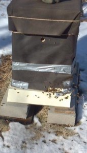 Last Monday, January 30, Mark made it to the prairie with a plate of bee fondant*, or bee candy, and a protein patty. It was hovering around 50 degrees, so he didn’t tear into the hive too much, but the girls were certainly active and flying around. He took off the lid and the bees boiled up from in-between the frames. That’s a great sign! Of course, we keep hearing that March is the month that is the real tests – if you’re going to suffer winter losses, March is when it happens. We’re trying to give them every advantage possible by feeing them now.